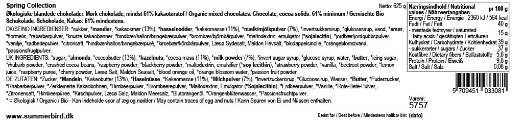 - Rhubarb -Let ristede spanske mandler, praliné, mørk chokolade Guayas 71 % og rabarber.